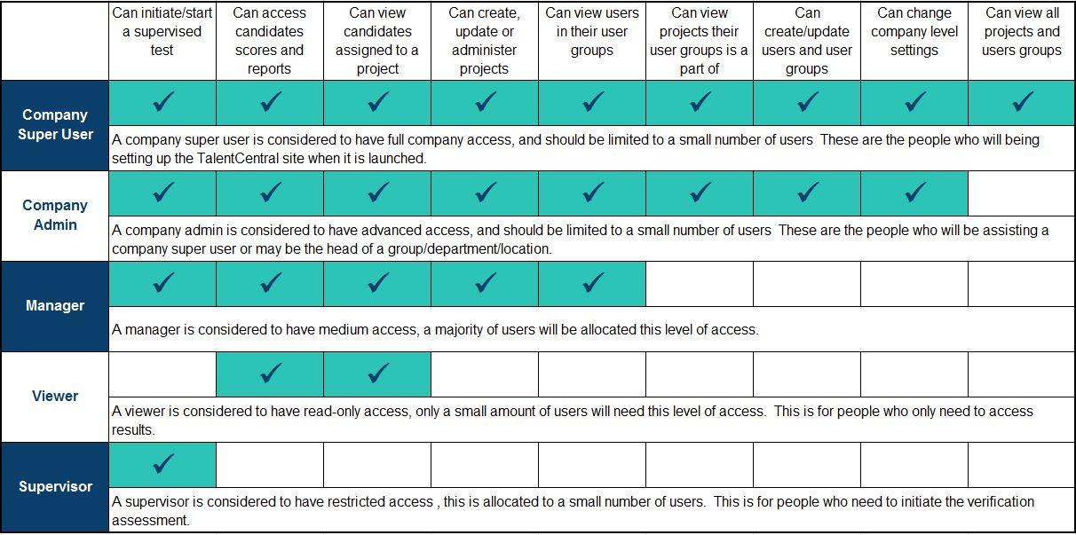 When creating a new user on the TalentCentral™ platform, the permission level you choose determines the level of access the user will have on the system. Some user levels, such as Manager, will be assigned more often, while Supervisor or Viewer are more restrictive and may be used less frequently. In order to avoid inadvertent changes to your company settings, Company Admin should only be selected for a limited number of trained individuals.