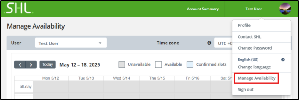 1. From the profile menu, go to “Manage Availability” and click “Calendar Settings”