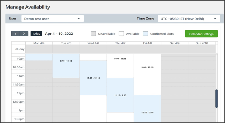 Interviewers may also add their general working hours to their calendar settings. The availability of the interviewer will be a combination of general working hours and calendar sync. Additionally, interviewers may mark free or busy slots using the interactive calendar on the “Manage Availability” page.