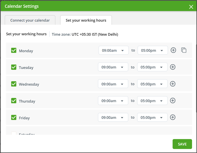 For example, if general working hours are set as Monday 9 am to 5 pm, the platform will assume time before 9 am and after 5 pm is unavailable. Within 9 am to 5 pm, the system will check for availability from the synced calendar.