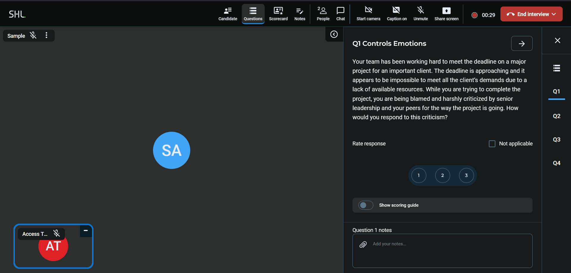 After leaving the interview room, interviewers may rate their interview experience. This rating may be shared with the hiring team and SHL for future improvements.