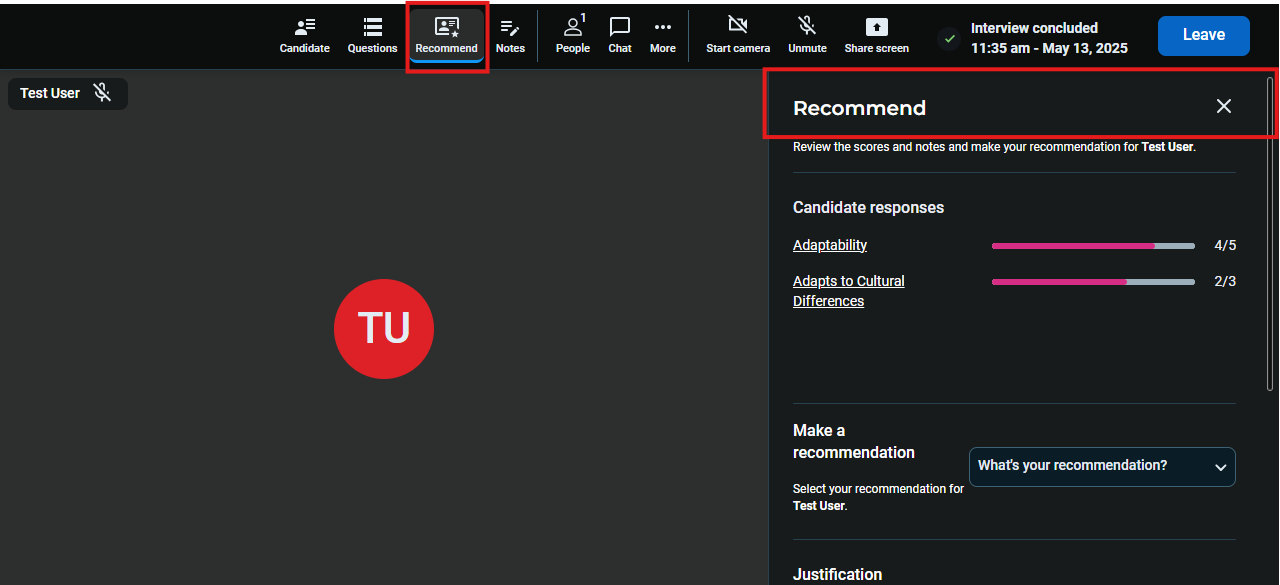 3. Note: Selecting “Leave” will allow individual user to leave the interview room, however this will not end the interview for other interviewers and candidate.