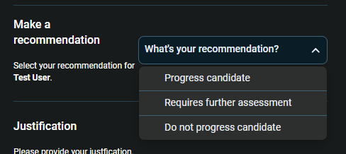- Justification is a free-text response area where interviewers can share the reasoning for theirrecommendation. This will be visible to recruiters and hiring managers on the candidate scorecard after the interview.