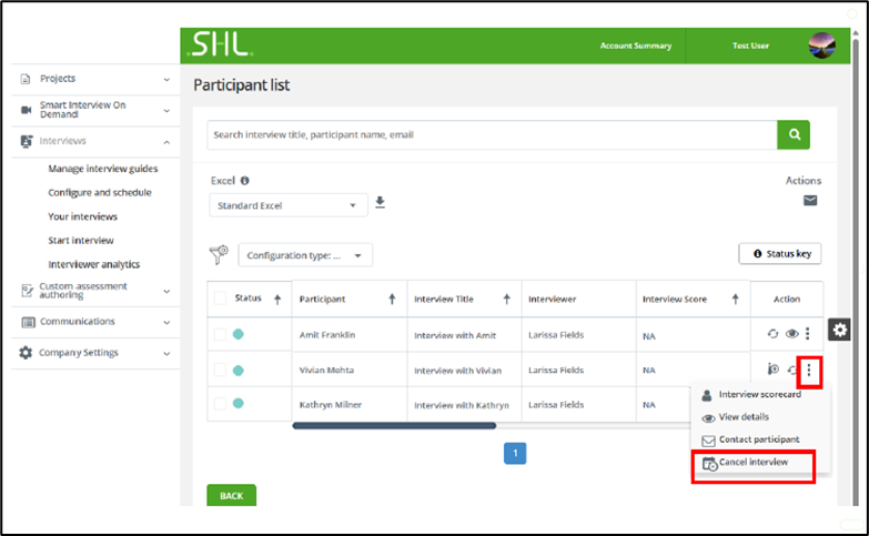 icon on the extreme right of the participant row and click on the 'Cancel Interview' Option